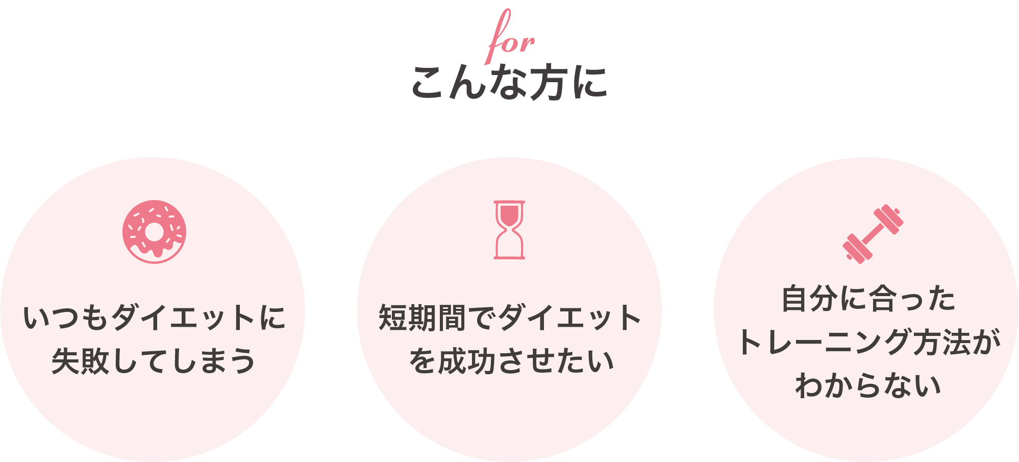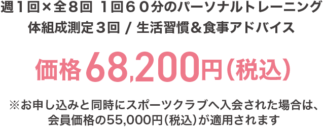 全8回・60分のパーソナルトレーニングで、 2ヶ月で-3kg、-3cmを目指すダイエットサポートプログラム。専門知識をもったトレーナーがカラダ測定&パーソナルトレーニングで理想のボディへ導きます。運動初心者・リバウンド経験者も安心して始められるダイエットプログラムです。