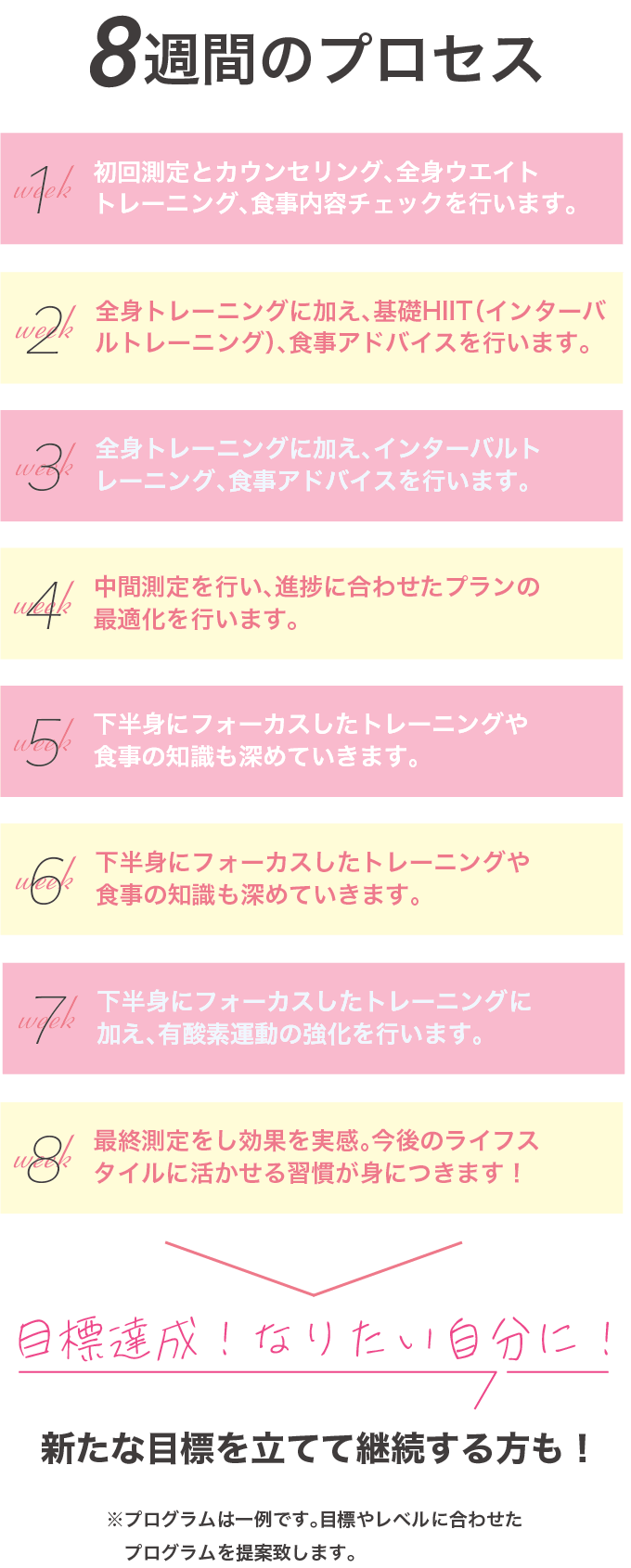 初回に体重や体脂肪率、筋肉量、ボディサイズ測定などをチェックし、目標に向けたトレーニングプランを作成。4 週目と8週目にはトレーニングの効果測定を行います。