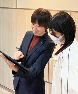 - 現在、社内では様々なプロジェクトが立ち上がっており、店舗での業務以外にも、それぞれの得意や強みを活かして多くの社員が参加しています。社歴や店舗の垣根を越えて活躍できるフィールドがあるのは非常に魅力的です。同じ志を持って活動できる仲間の存在は大きく、それが仕事への大きなやりがいにも繋がっています。風通しが良く、社員一人ひとりの意欲を尊重する雰囲気です。